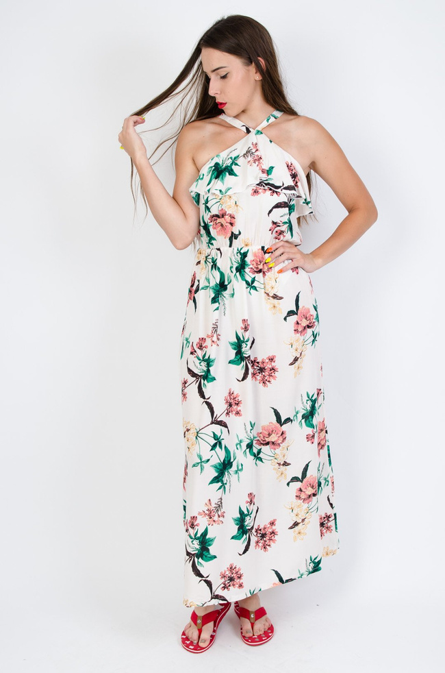 Kremowa sukienka pod szyję w kwiaty- guma w pasie