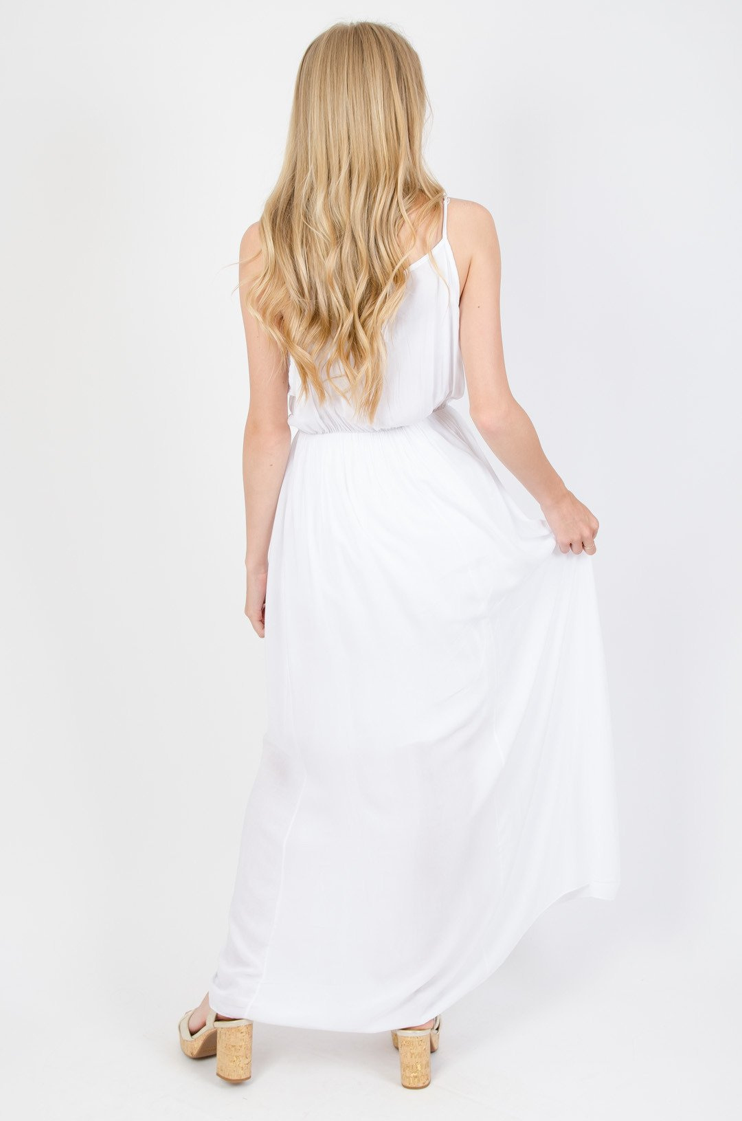 Biała długa sukienka obszyta cekinami- guma w pasie .
