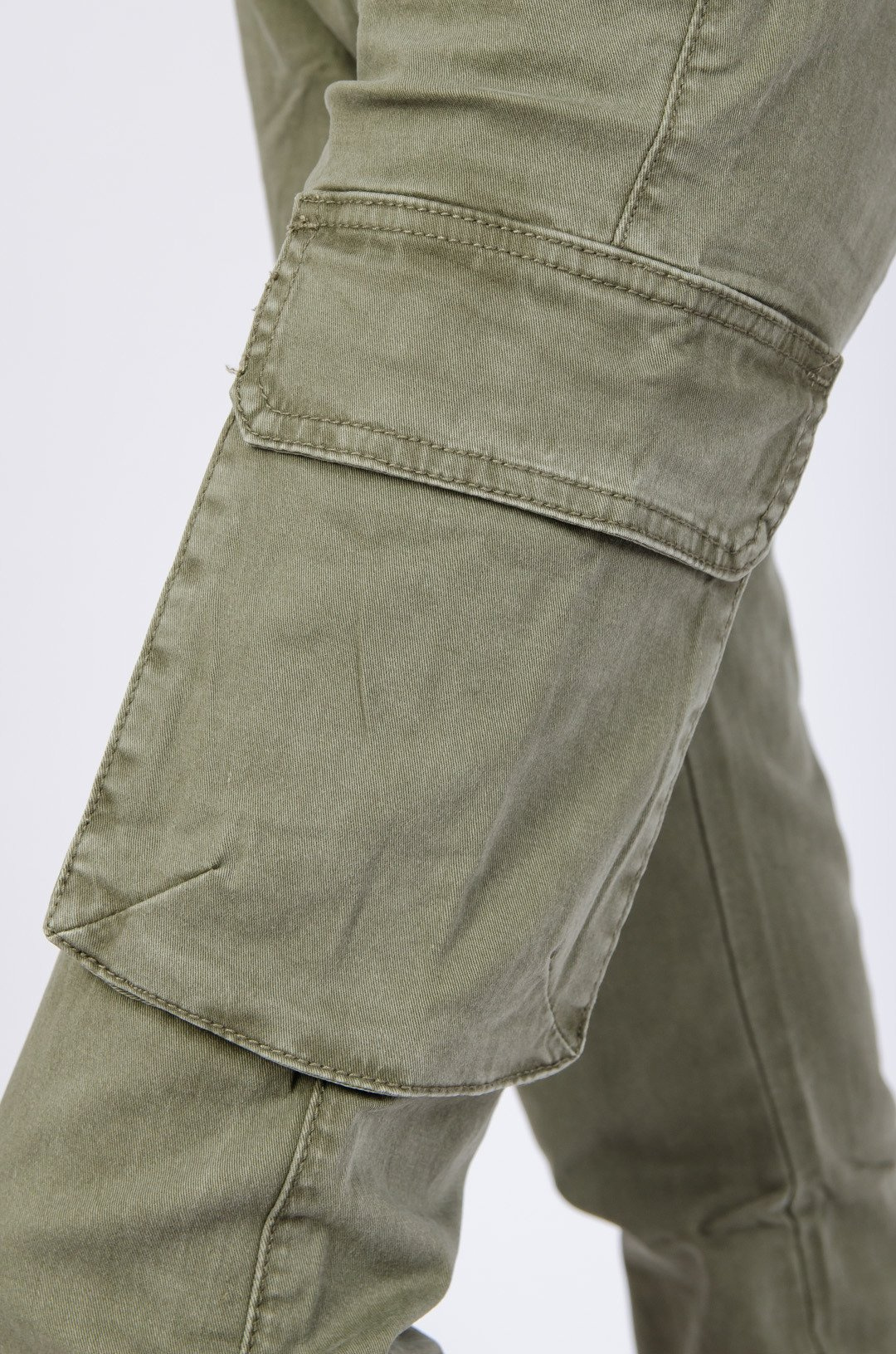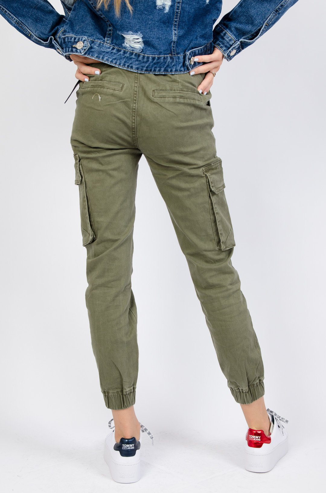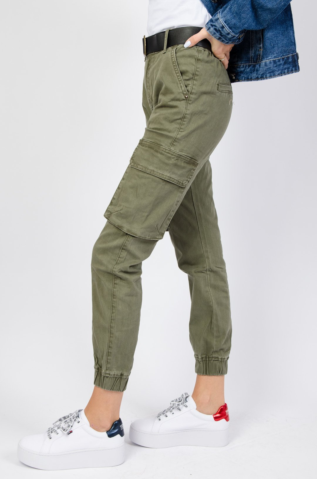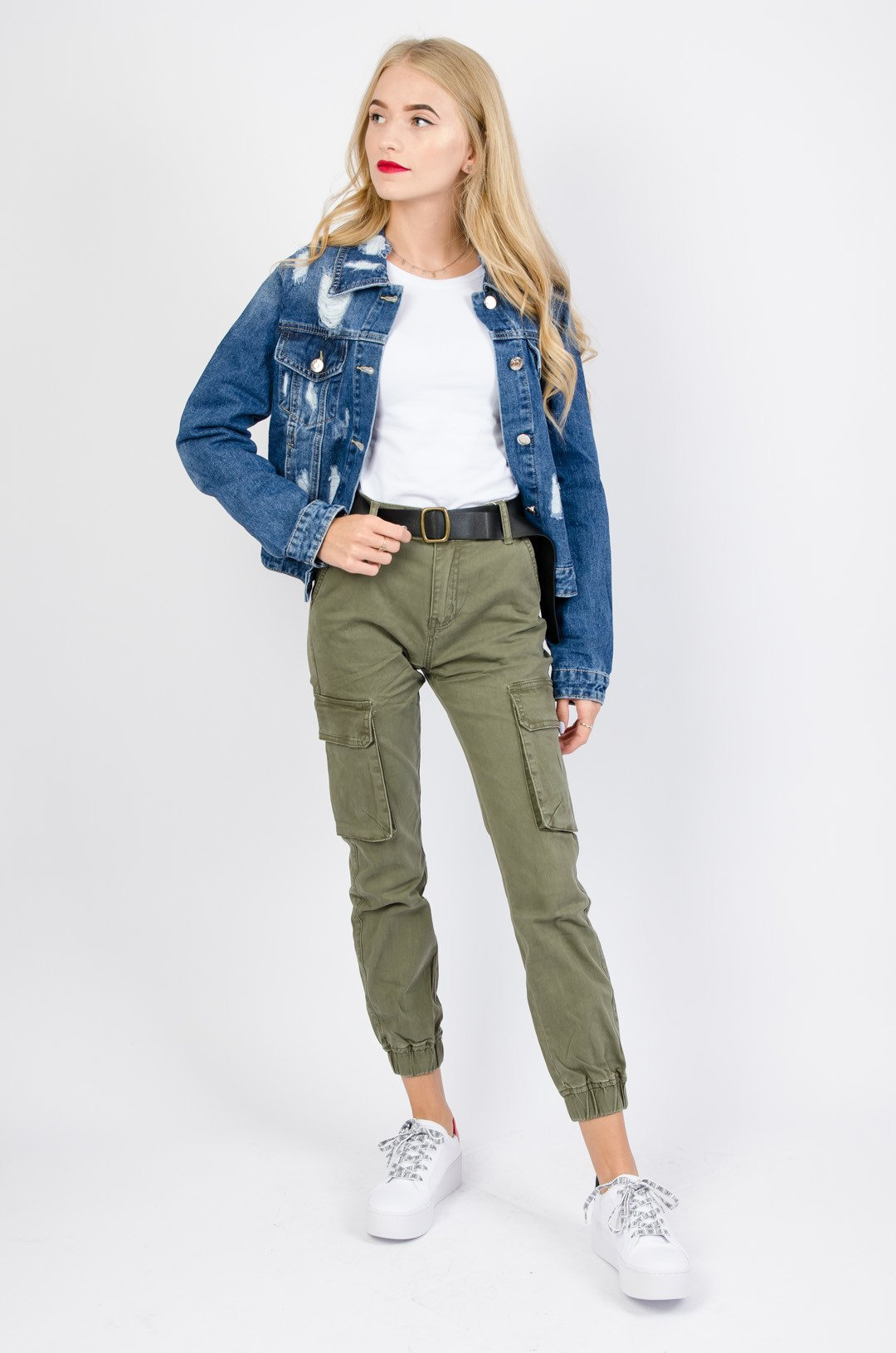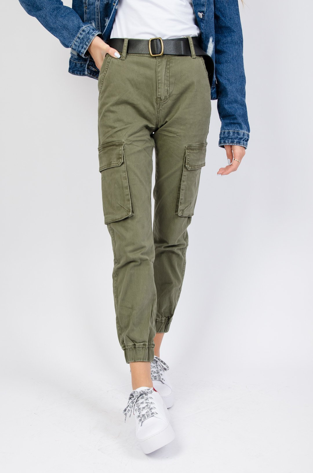 Zielone bojówki z wysokim stanem