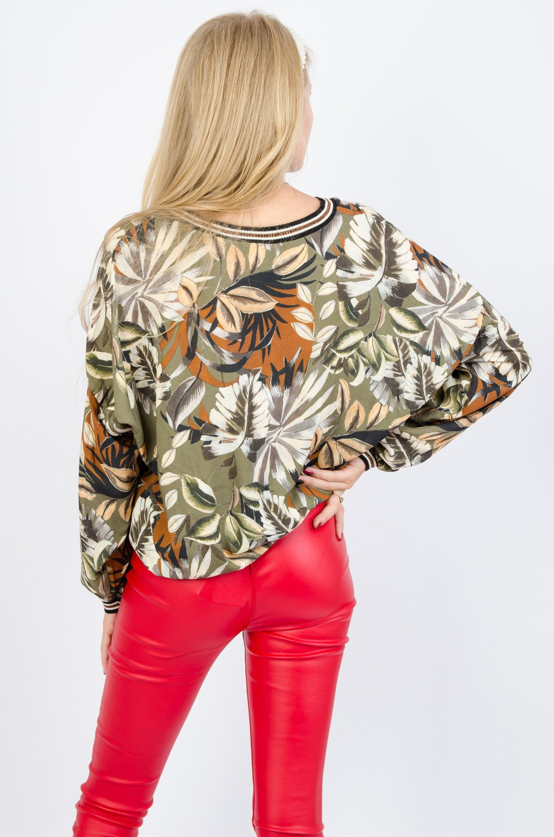 Zielona bluza w liście z dekoltem w szpic