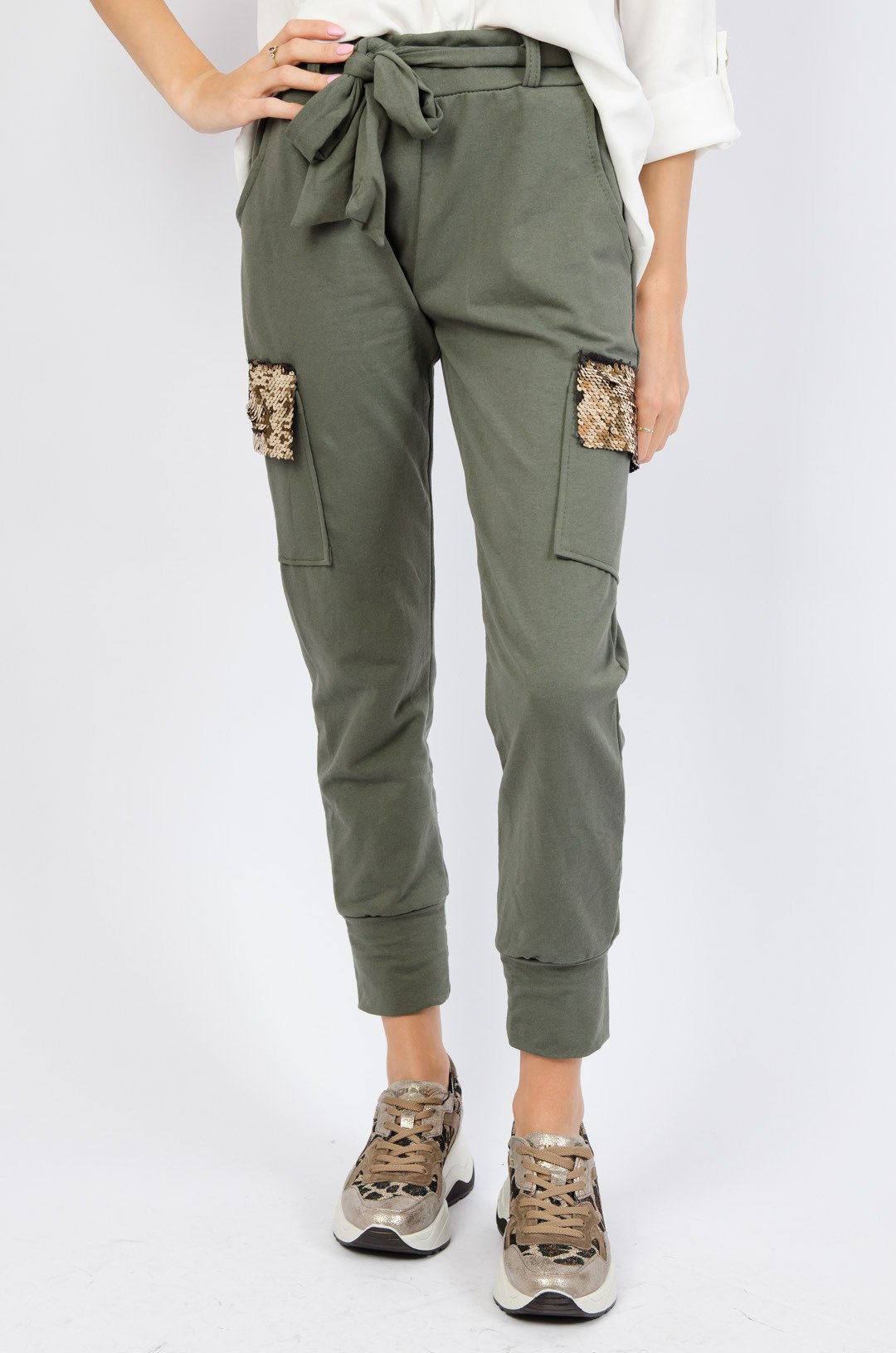 Zielone dresowe bojówki z cekinami na kieszeniach
