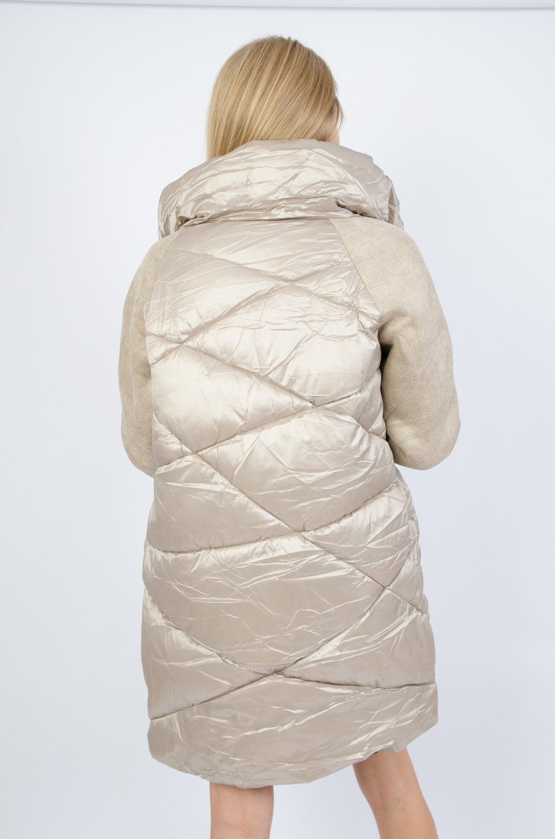Beżowy pikowany płaszczyk z kożuchem na rękawach