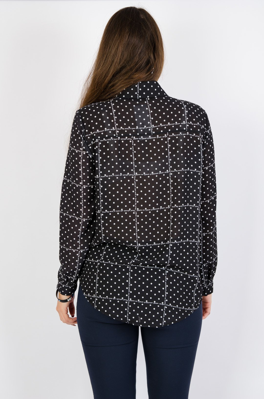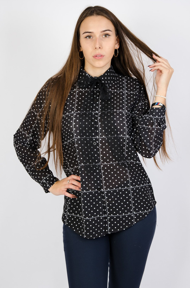 Koszula posiada czarną wstążkę do wiązania pod szyją.