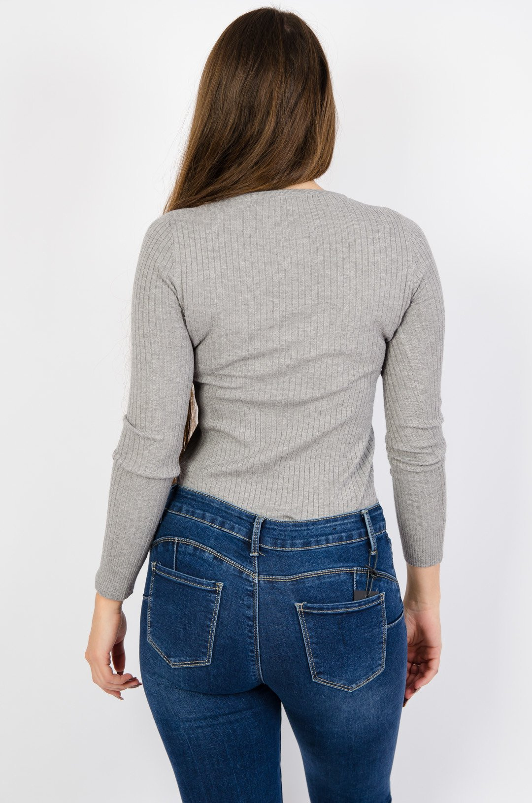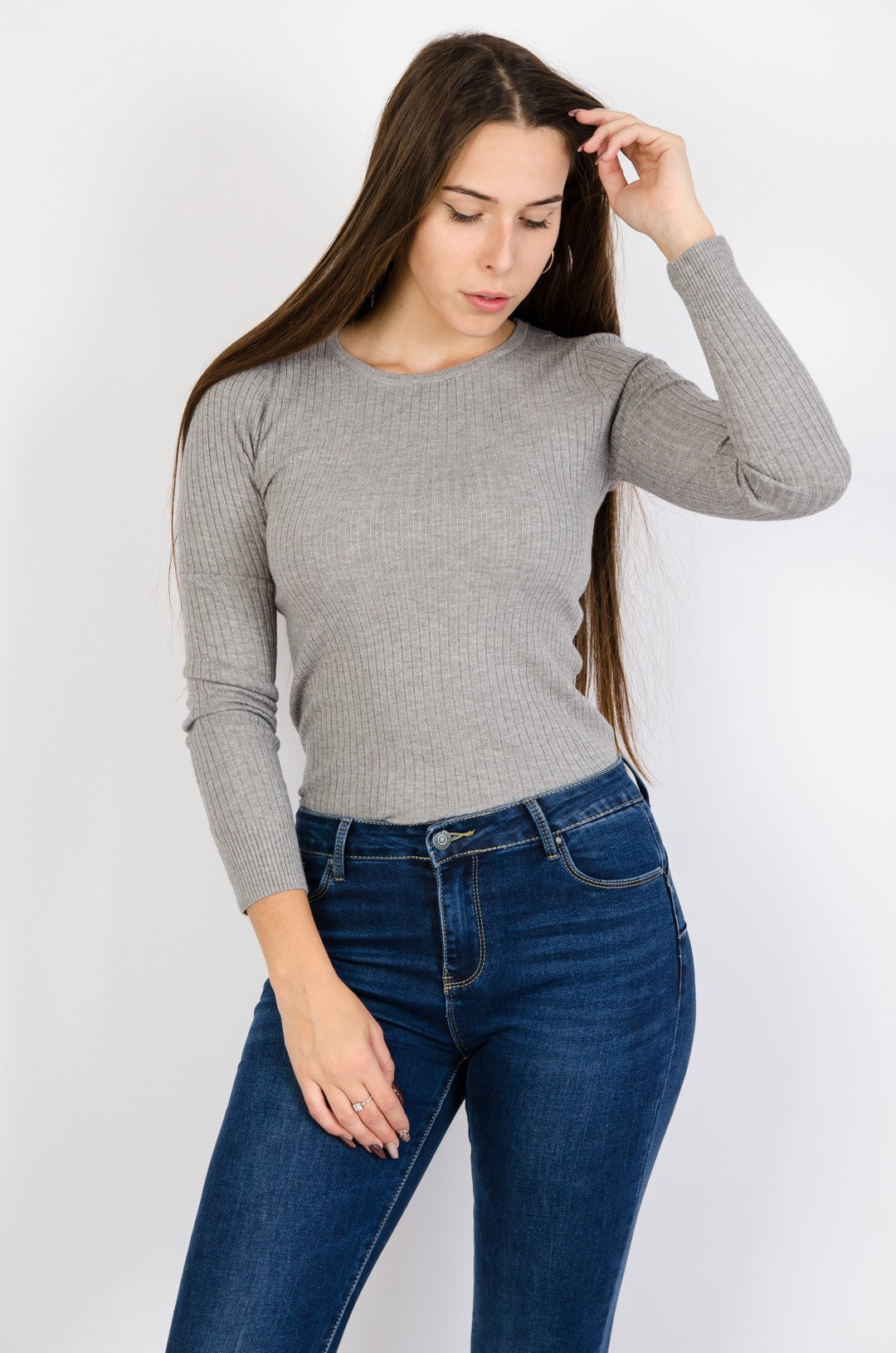 Szary dopasowany sweter z prążkowanej dzianiny.