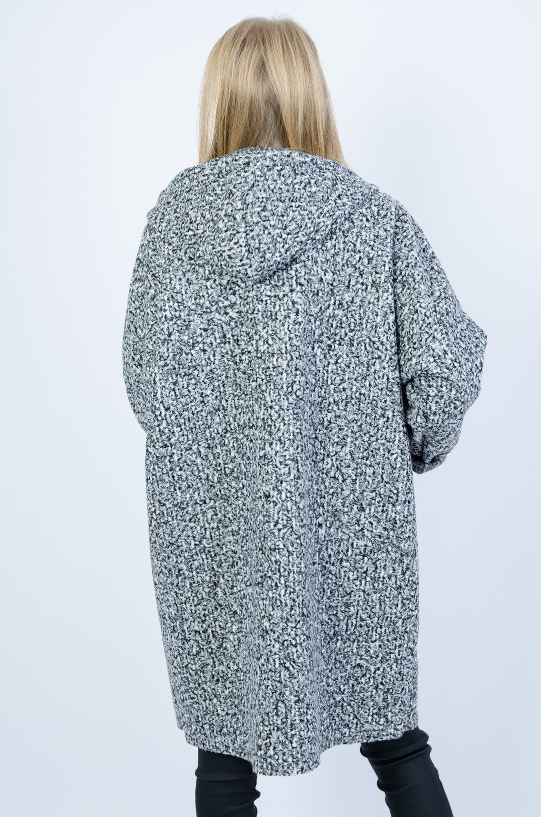 Szary jesienny płaszcz z kapturem oraz naszywką na kieszeni