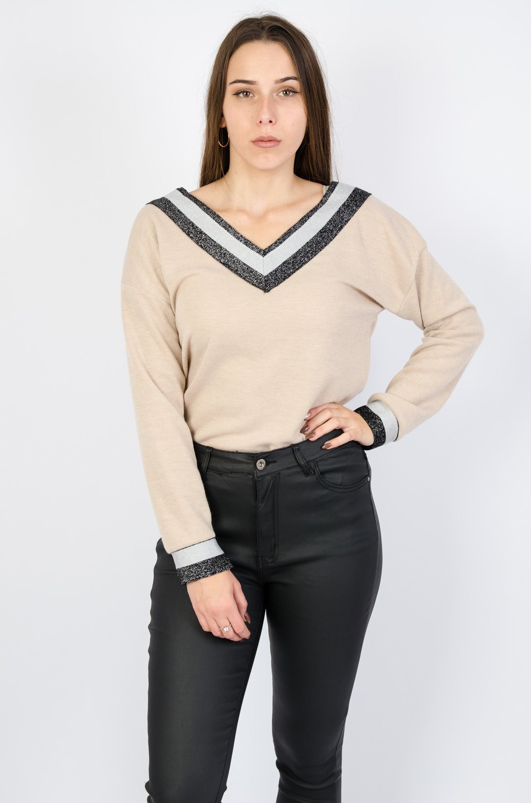 Beżowa bluzka z brokatowymi wstawkami w dekolcie i rękawach