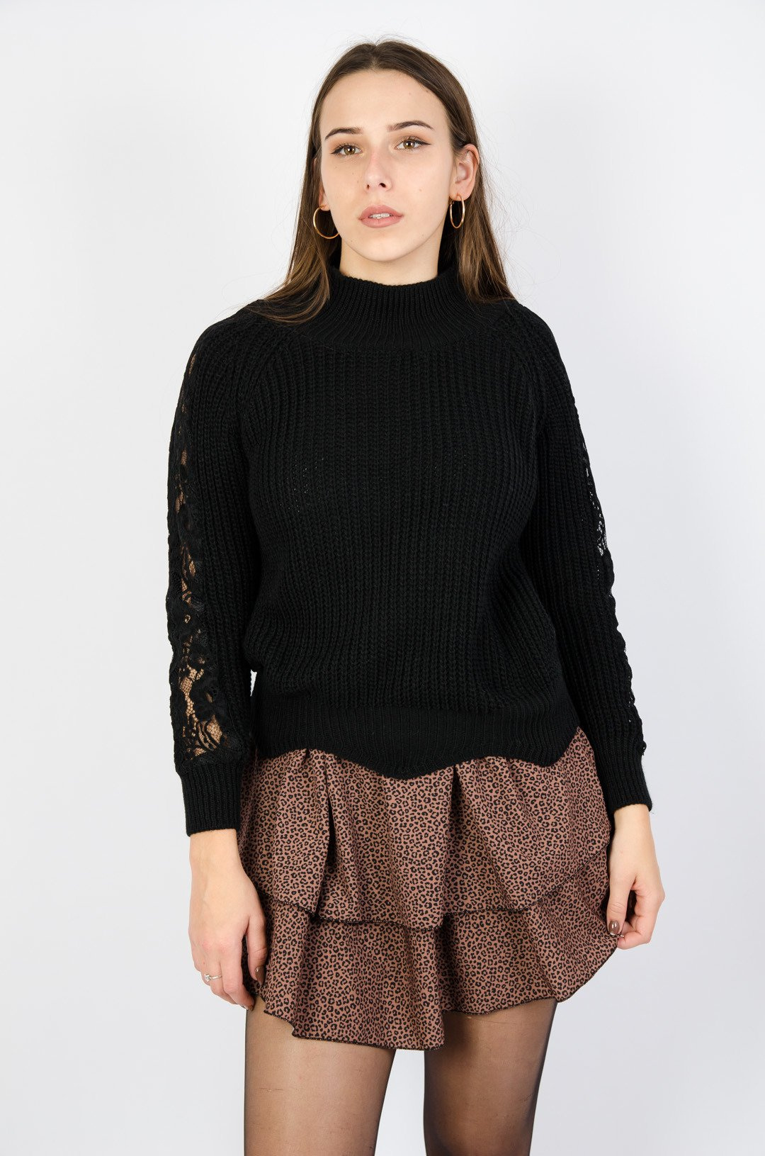 Czarny sweter z półgolfem oraz koronką na rękawach