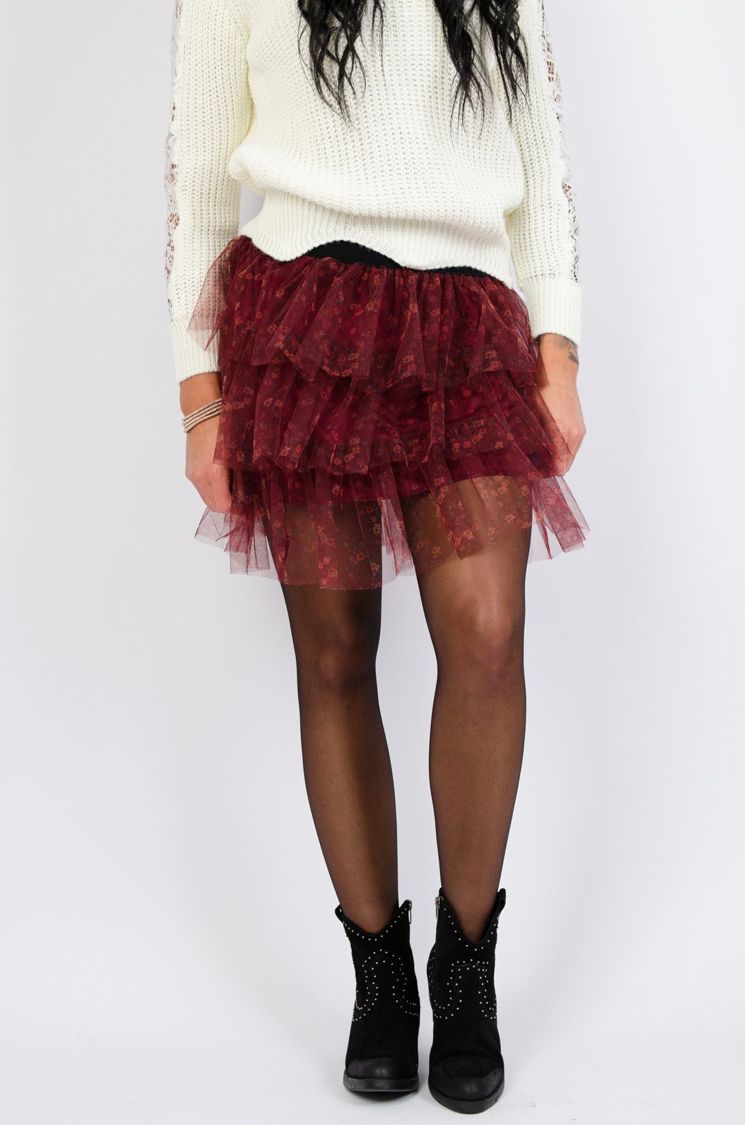 Bordowa tiulowa spódnica mini w drobne kwiatki.