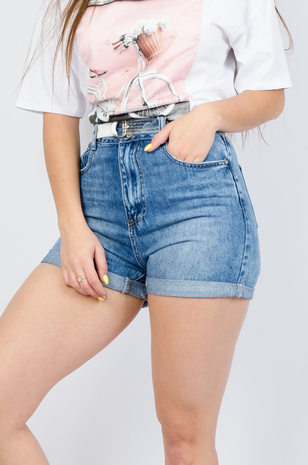 Jeansowe szorty z wysokim stanem oraz podwijanymi nogawkami