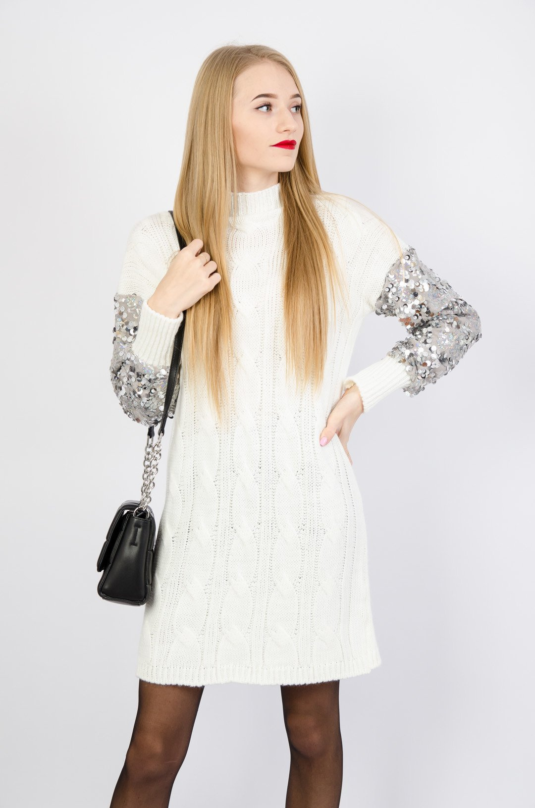 BIAŁA SWETERKOWA SUKIENKA Z CEKINOWYMI RĘKAWAMI